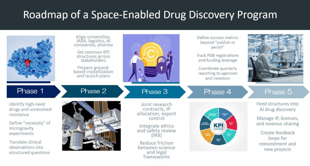 たとえば、非小細胞肺がんのEGFR耐性変異(C797S)を対象とする場合、我々は臨床データと論文情報を整理し、大学・研究機関に地上での予備結晶化試験体制を整備する。同時に、JAXAや宇宙輸送企業と打ち上げ・回収スケジュールを調整する。この段階で重要なのは、科学的内容ではなく、科学を動かす制度の整備である。共同研究契約、発明者帰属、輸出管理、安全審査、倫理審査の手順を我々がまとめ、研究者が実験に集中できる環境を作る。