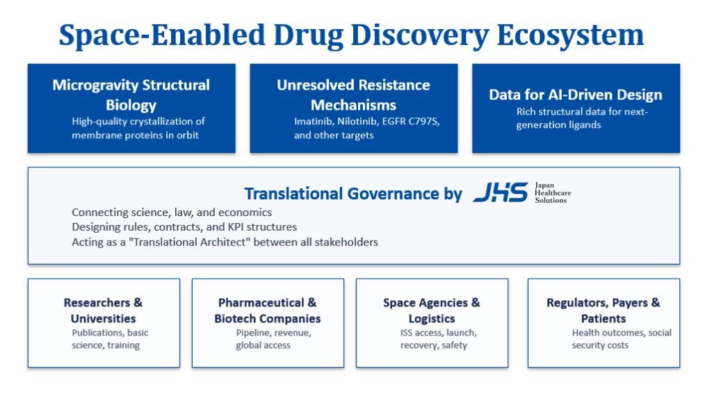 微小重力環境を利用したタンパク質の結晶化への取り組みは、この課題を突破する現実的な手段として注目される一方、ロジスティクスをはじめ・IP・契約・安全管理・宇宙法など、科学以外の課題が絡み合う複合領域でもある。私たちJapan Healthcare Solutionsがこれらを統合し、科学・制度・ビジネスを貫く“トランスレーター”としてのガバナンスを設計することで、宇宙を創薬インフラの一部として社会に根づかせることを支援していく。